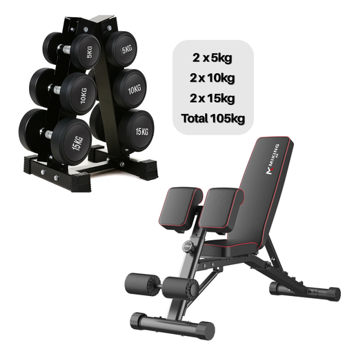 5kg to 15kg (3 pairs - 60kg) round Dumbbell & Storage Rack & Adjustable Bench Bundle