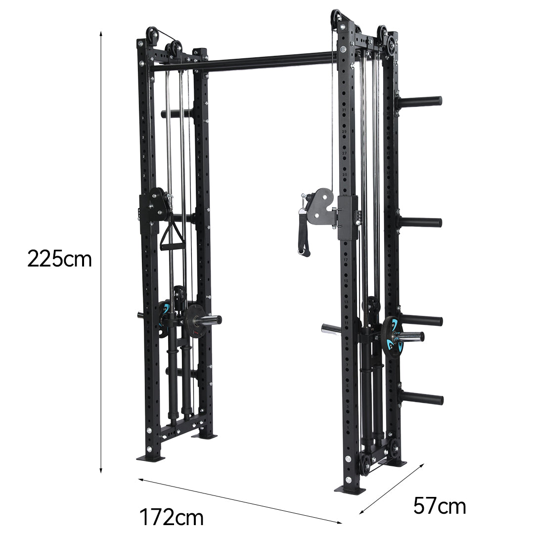 This multifunctional Smith Machine combines a Half Cage, Plates-Loaded Cable Crossover System, Chin-Up Bar