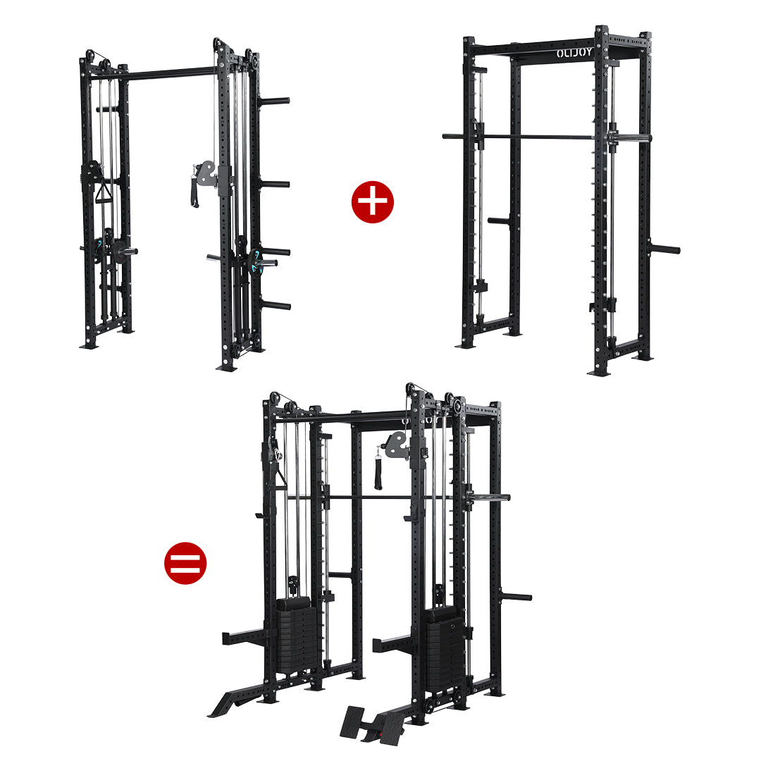 This versatile Half Cage is equipped with a Chin-Up Bar, Weight Bar, and a Cable Crossover System —Extendable – Start with one exercise and expand to full-body training, all in one spot.