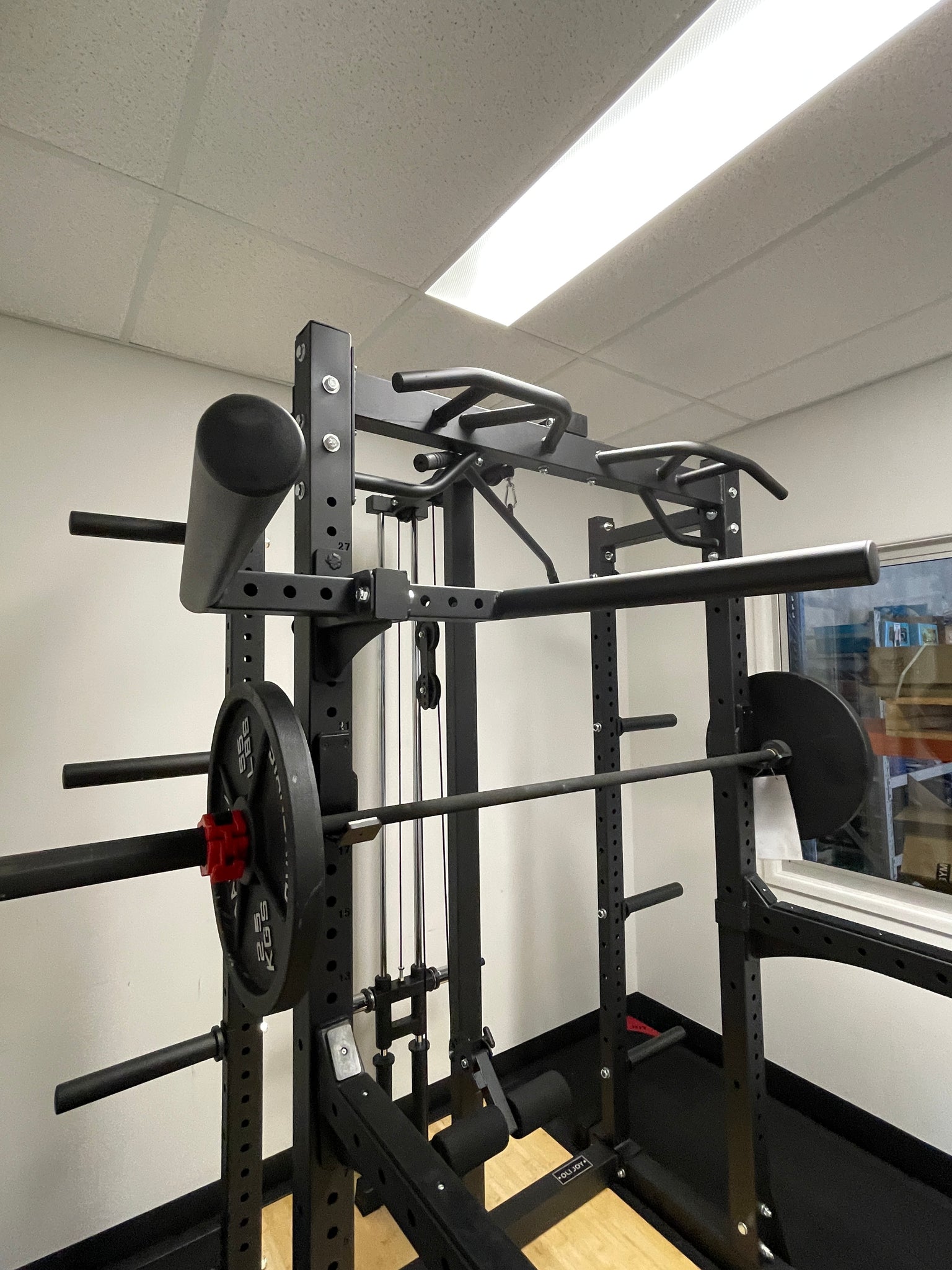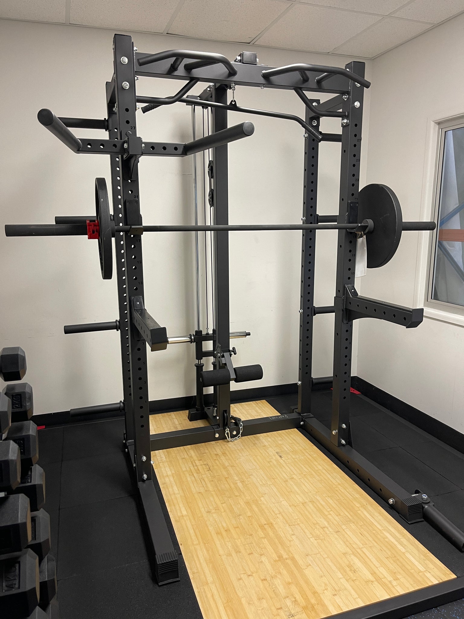 - ALL IN ONE – multifunctional squat rack, free weight training rack, lat pull down system + adjustable knee support beams, landmine, adjustable dip bar, chin up bar