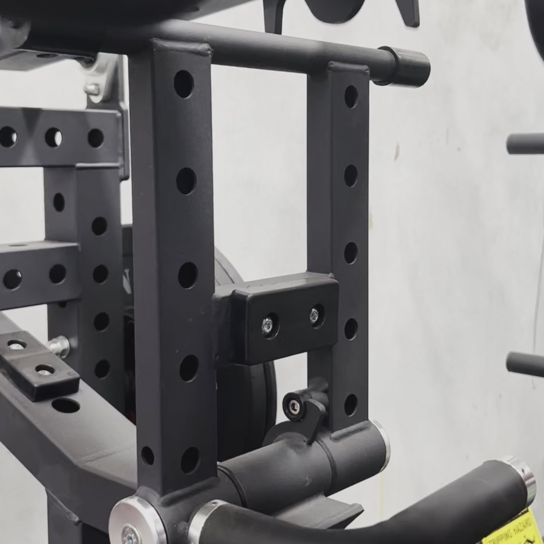Supportive shoulder pads provide stability and comfort during loaded squat patterns. The inclined footboard assists with consistent foot placement and balance, while integrated safety locking points allow users to start and finish sets securely, particularly during higher-load training.