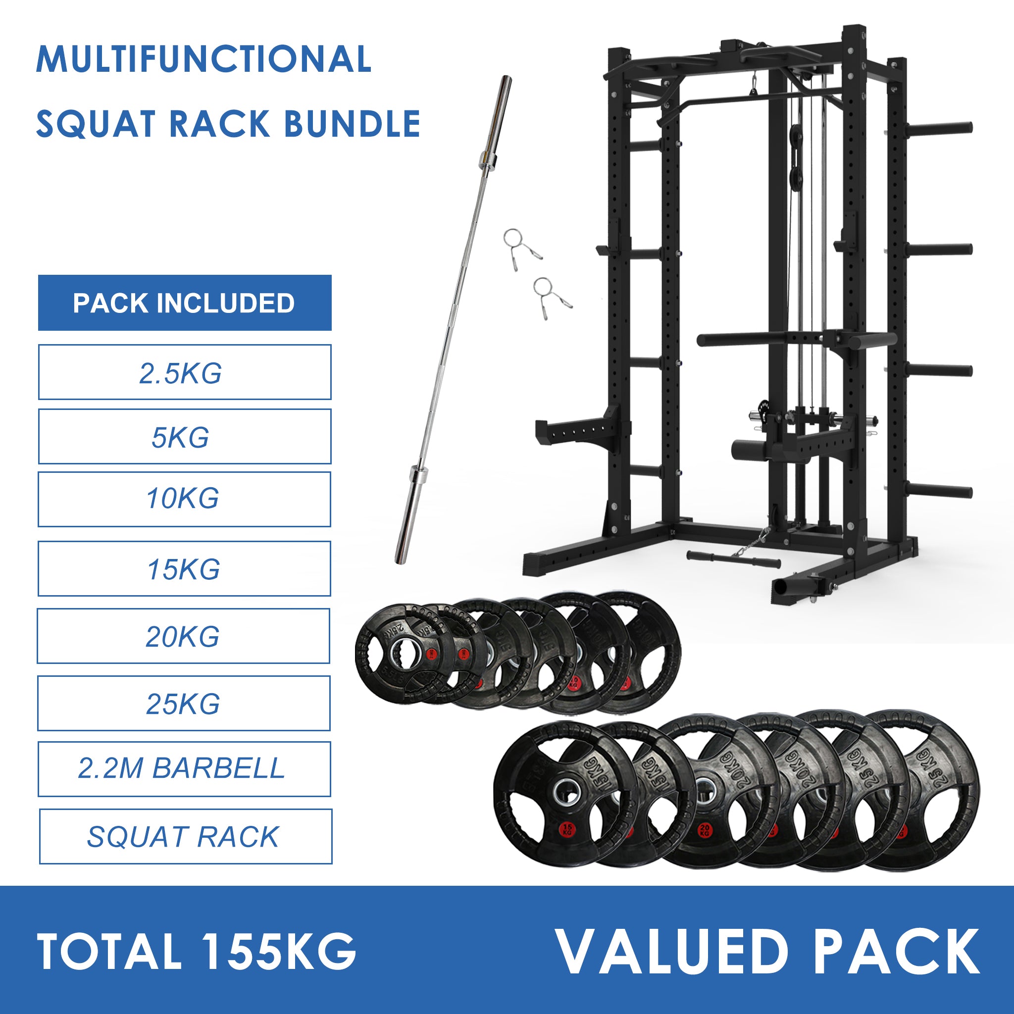 Preorder Multifunctional Squat Rack Bundle - 155kg Rubber Weight Plates & Barbell