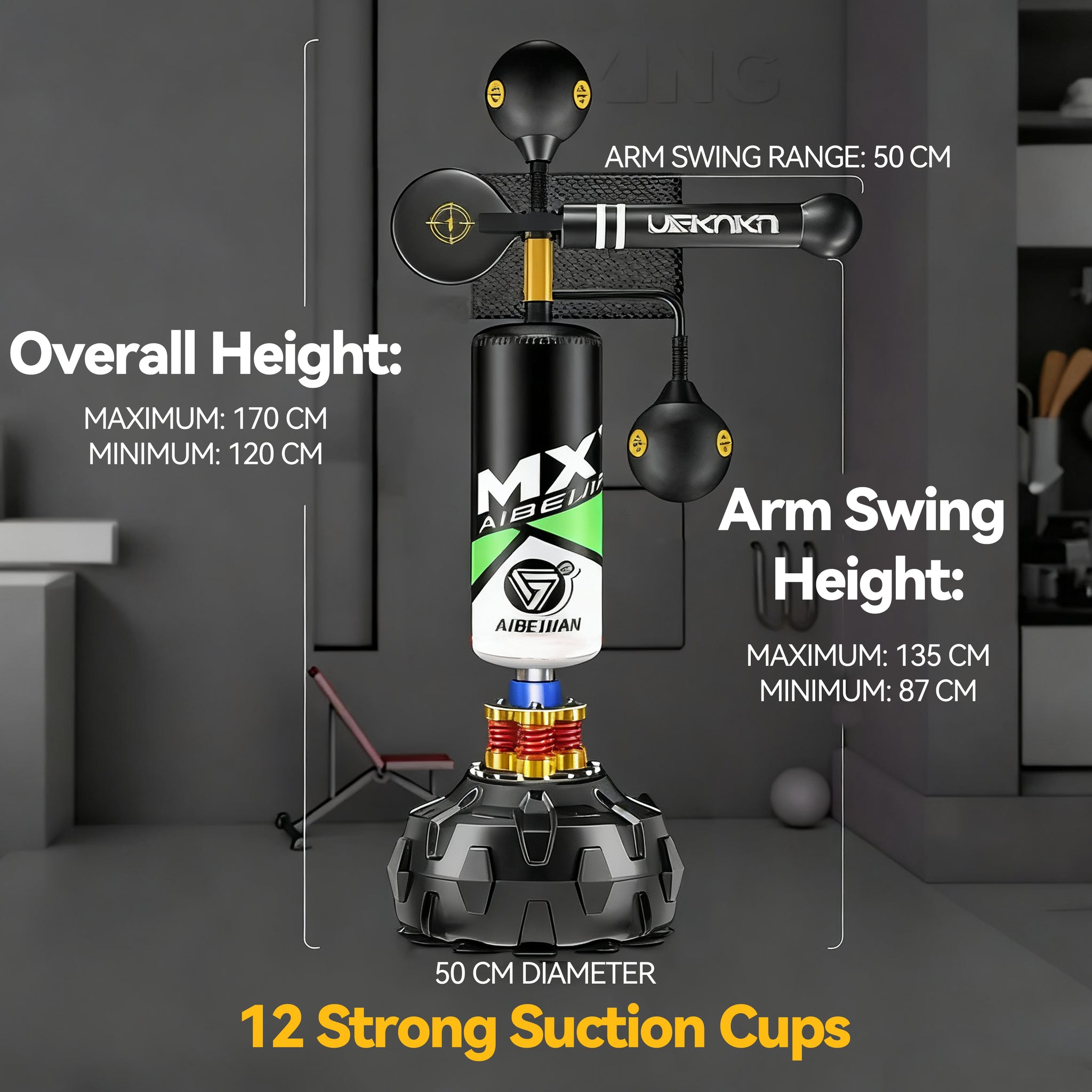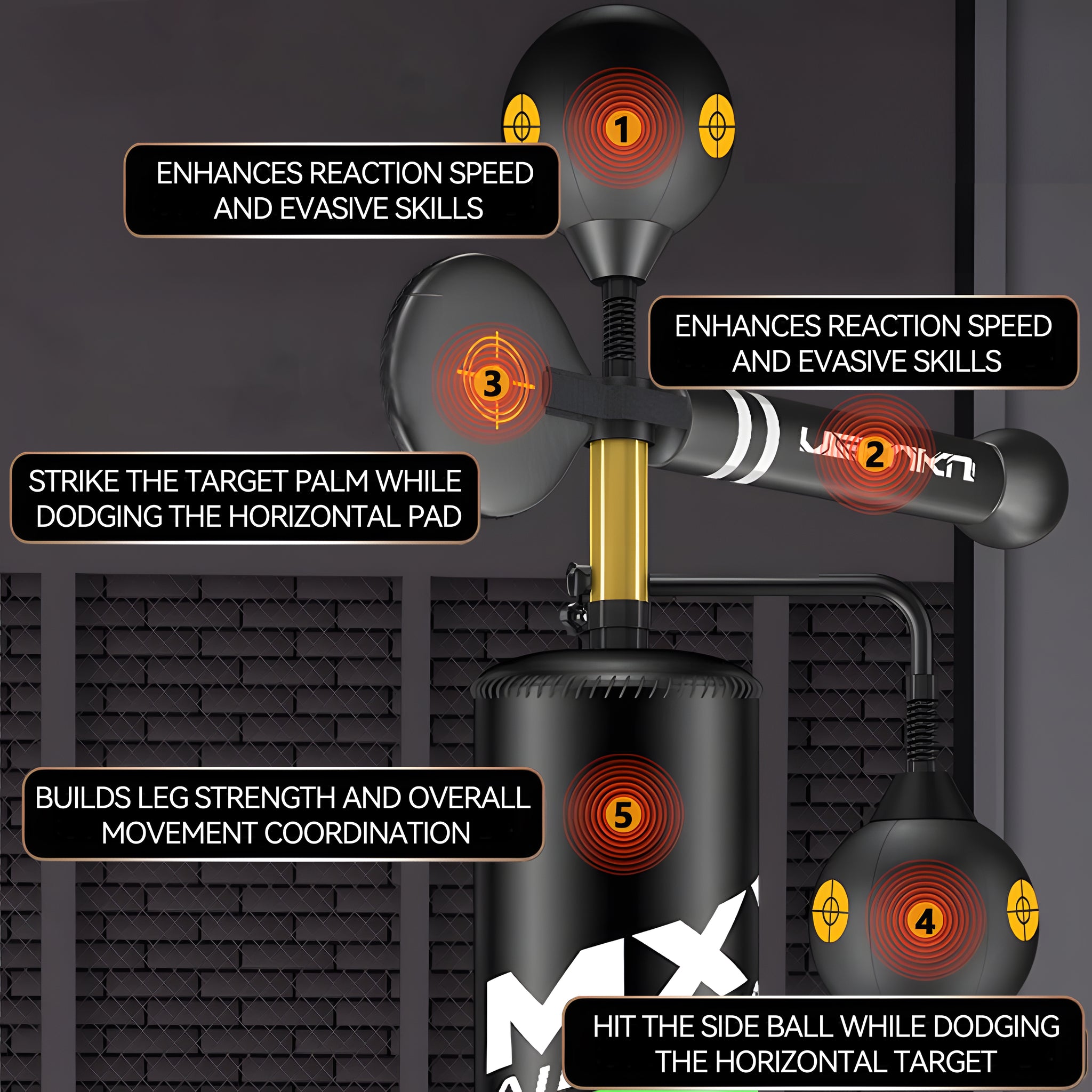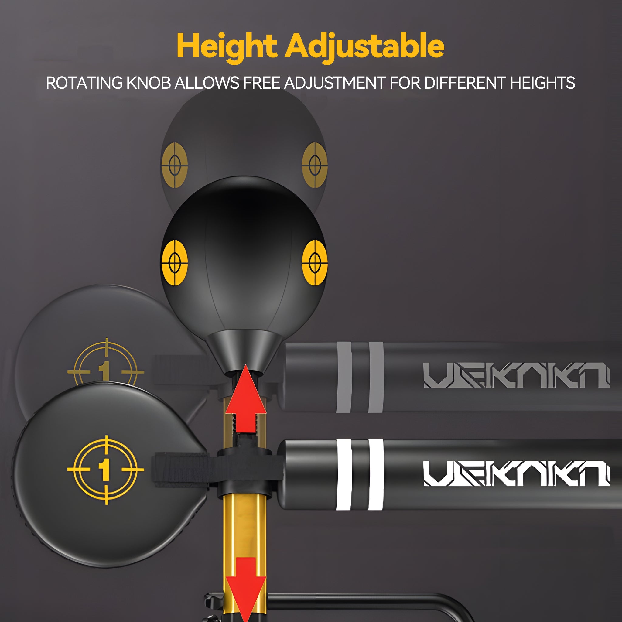 The Boxing Speed Trainer 360° Punching Spinning Bar is a freestanding boxing bag system designed to improve speed, coordination, and reaction time. Acting as a punch bag, boxing bag, and heavy punching bag stand in one, it’s perfect for home gyms, families, and beginner to intermediate fighters. With multiple striking targets and adjustable height, this free standing heavy bag setup brings professional-style training into your home.