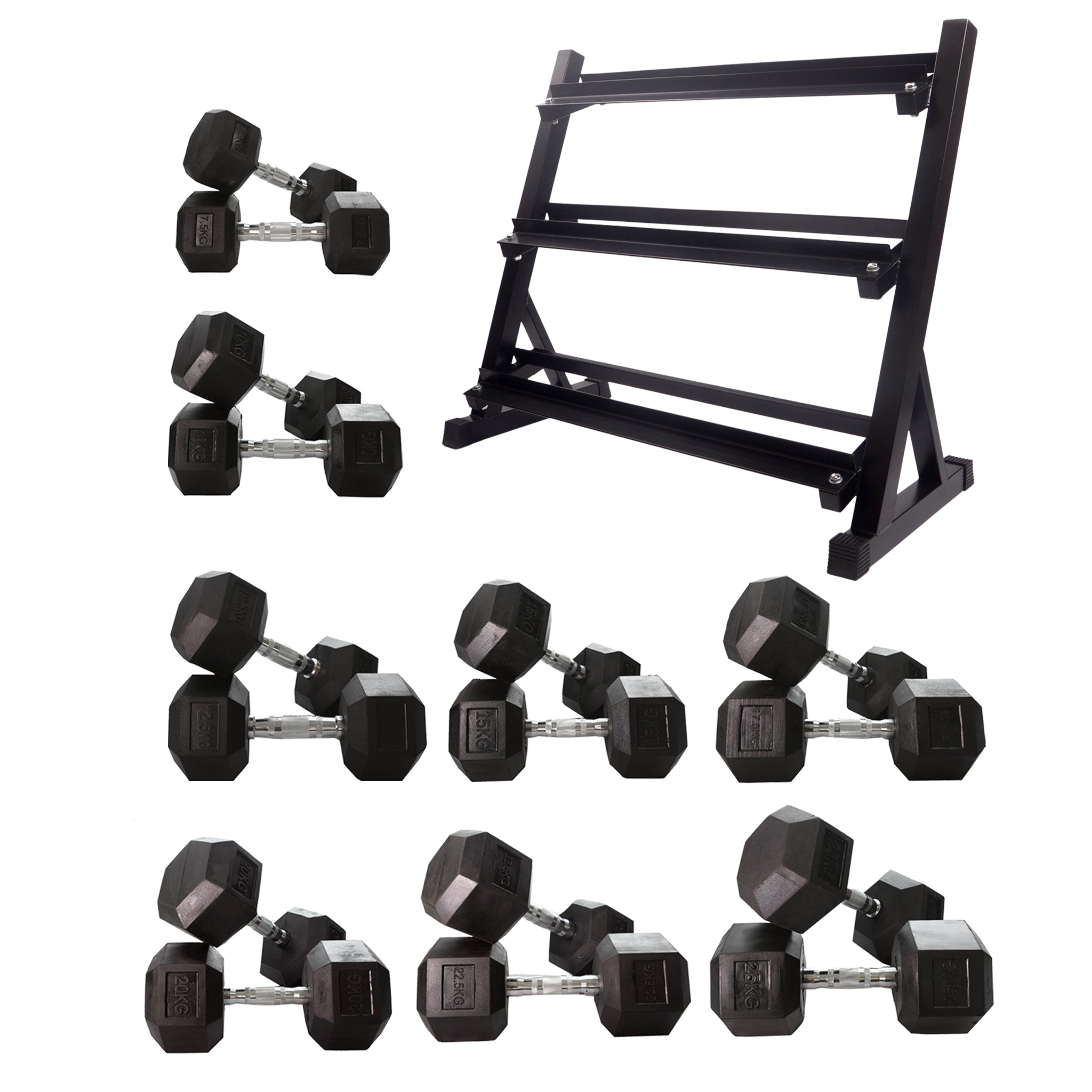 With three angled tiers that fit various dumbbell sizes and styles the 3 Tier Dumbbell Rack is made with a sturdy steel frame with a powder coat finish. This heavy duty equipment allows you to store and organise your dumbbells conveniently and boasts an ergonomic design and commercial-grade steel construction.Load it up with your set of dumbbells and this unit is ready when you are.