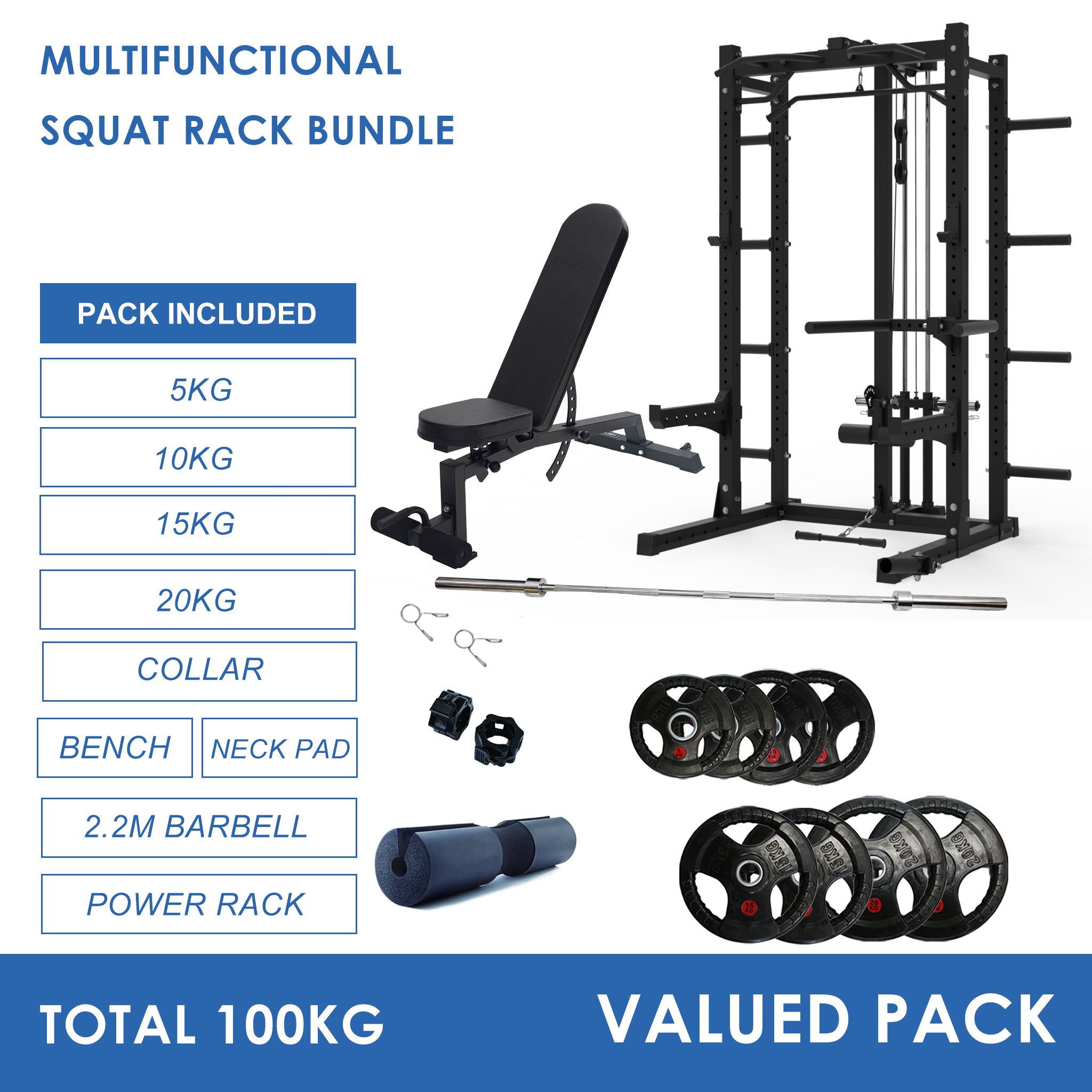 Preorder Multifunctional Squat Rack Bundle - 100kg Rubber Weight Plates, Barbell & Workout Bench