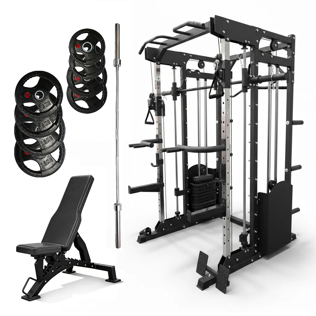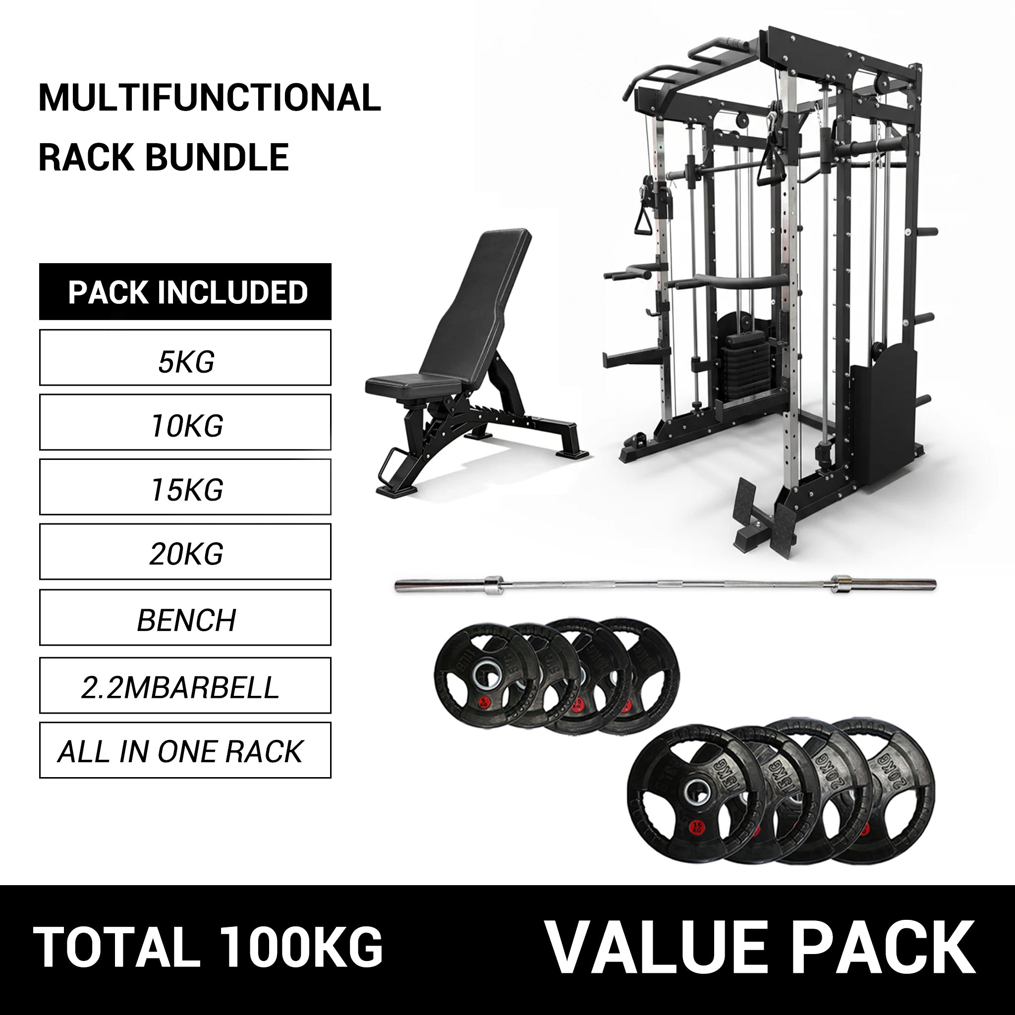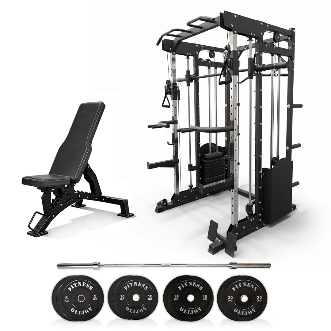 Oli Joy 10-in-1 Power Rack with Smith Machine,300LB Stack, 100KG Rubber Plates, Barbell & Bench Bundle