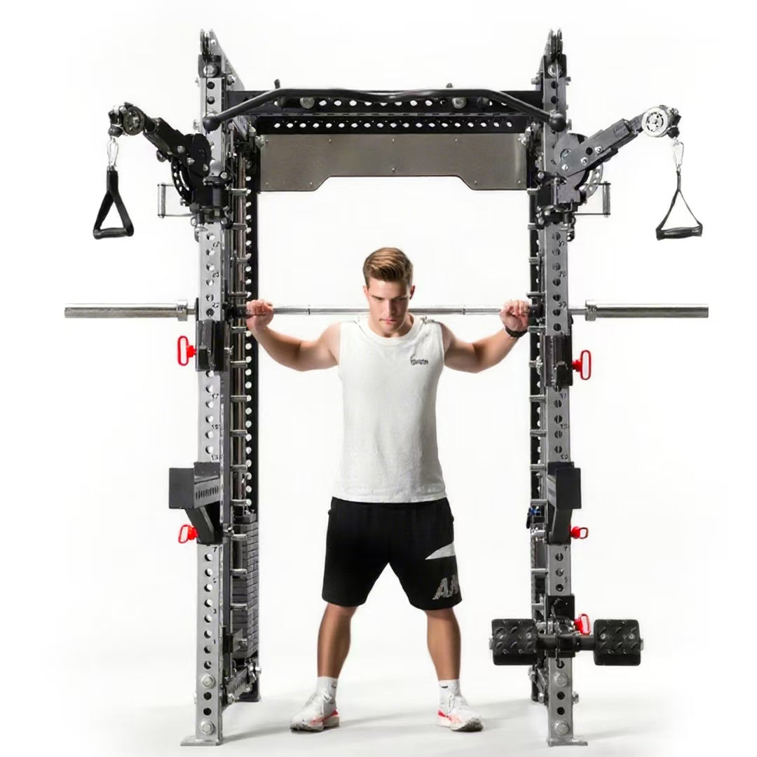 This all-in-one Smith machine Cable crossover machine Pin load is built for serious strength training. Combining a power rack, functional cable system, lat pulldown, low row station, and multi-grip pull-up bar in one compact footprint, it offers everything needed for a full-body training experience.