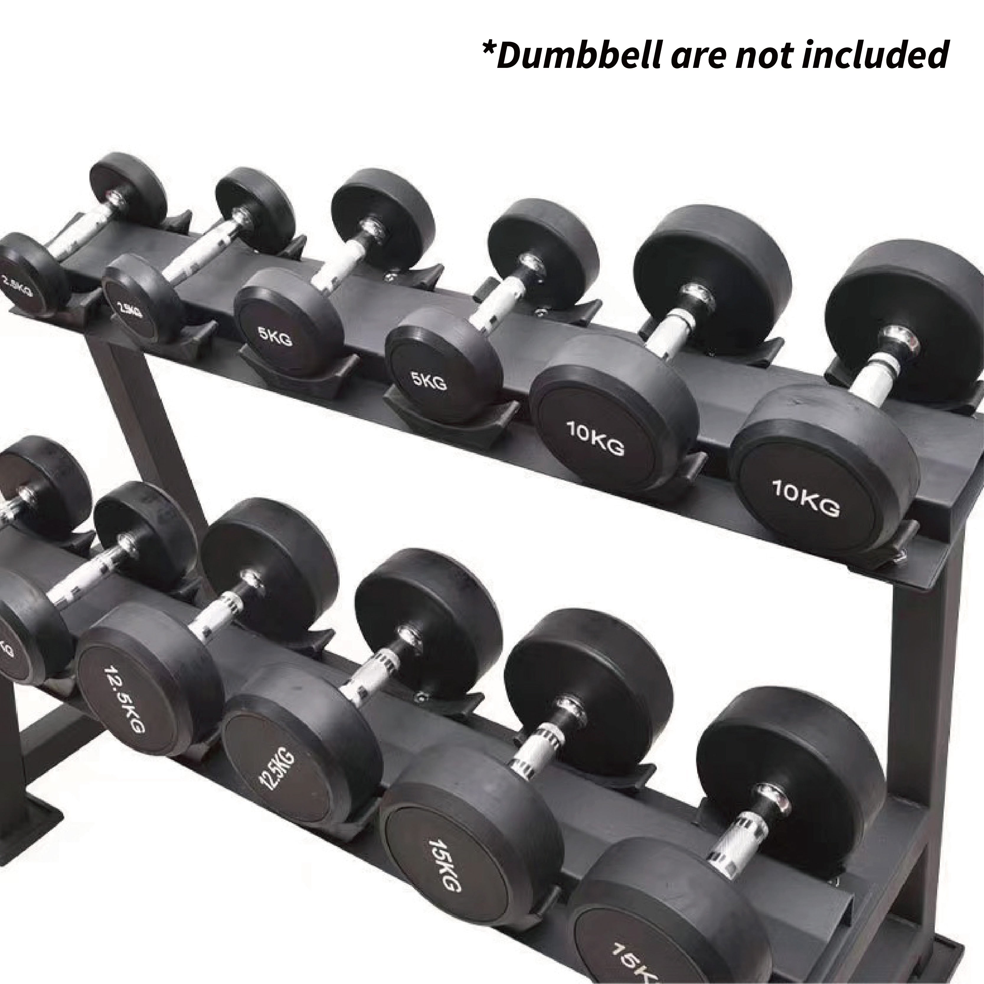 With two angled tiers that fit round dumbbell sizes, the 2 layers dumbbell Rack is made with a sturdy steel frame with a powder coat finish. This heavy duty equipment allows you to store and organize your dumbbells conveniently and boasts an ergonomic design and commercial-grade steel construction. Load it up with your set of dumbbells and this unit is ready when you are.