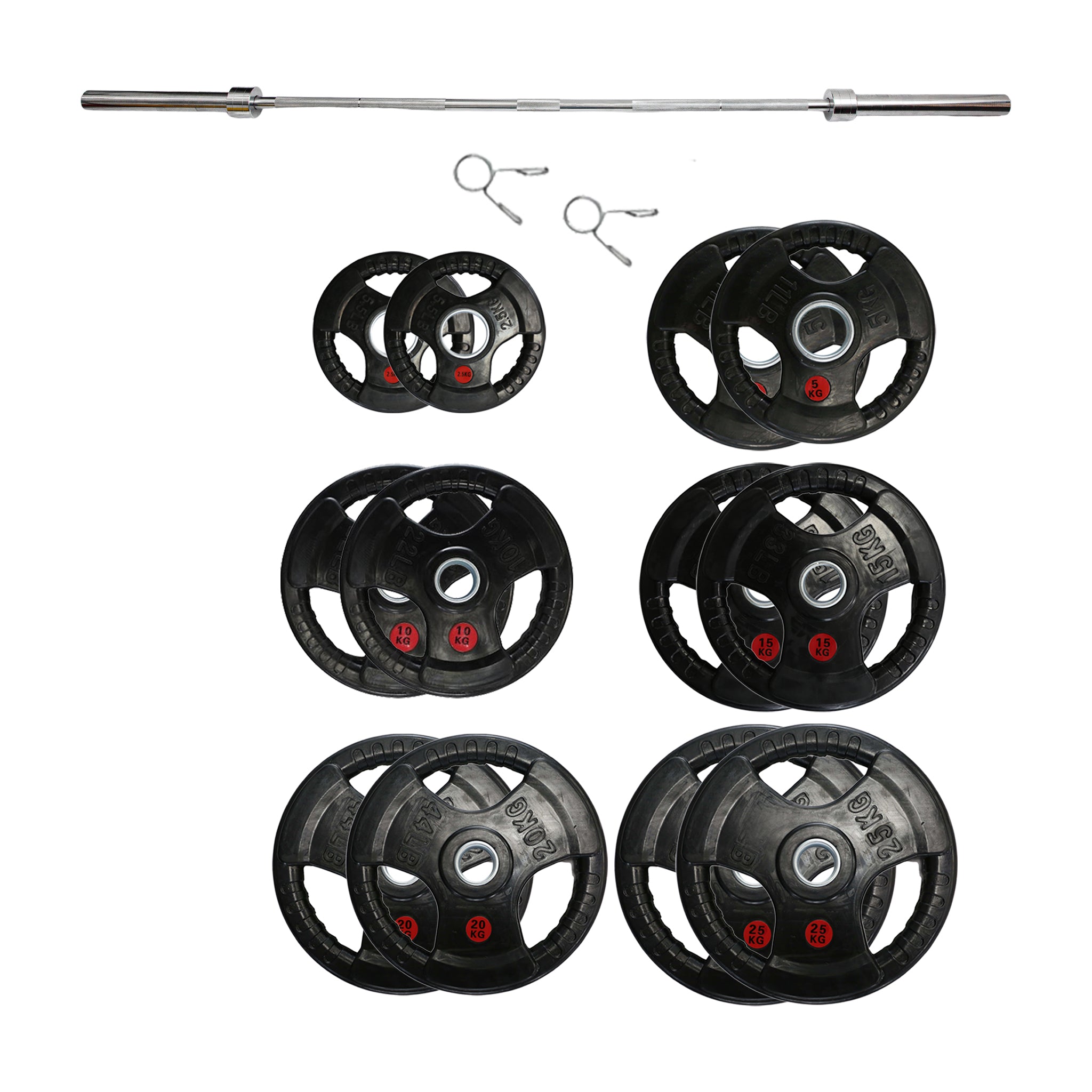 - The set includes 2.5kg, 5kg, 10kg, 15kg, 20kg, 25kg weight plates.